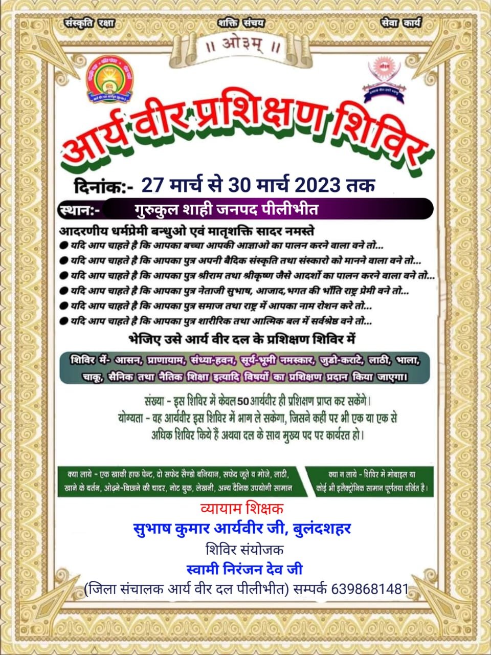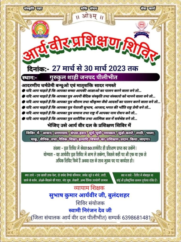 भेजिए उसे आर्य वीर दल के प्रशिक्षण शिविर में शिविर में आसन, प्राणायाम, संध्या-हवन, सूर्य-भूमी नमस्कार, जुडो-कराटे, लाठी, भाला, चाकू, सैनिक तथा नैतिक शिक्षा इत्यादि विषयों का प्रशिक्षण प्रदान किया जाएगा। संख्या इस शिविर में केवल 50 आर्यवीर ही प्रशिक्षण प्राप्त कर सकेंगे।