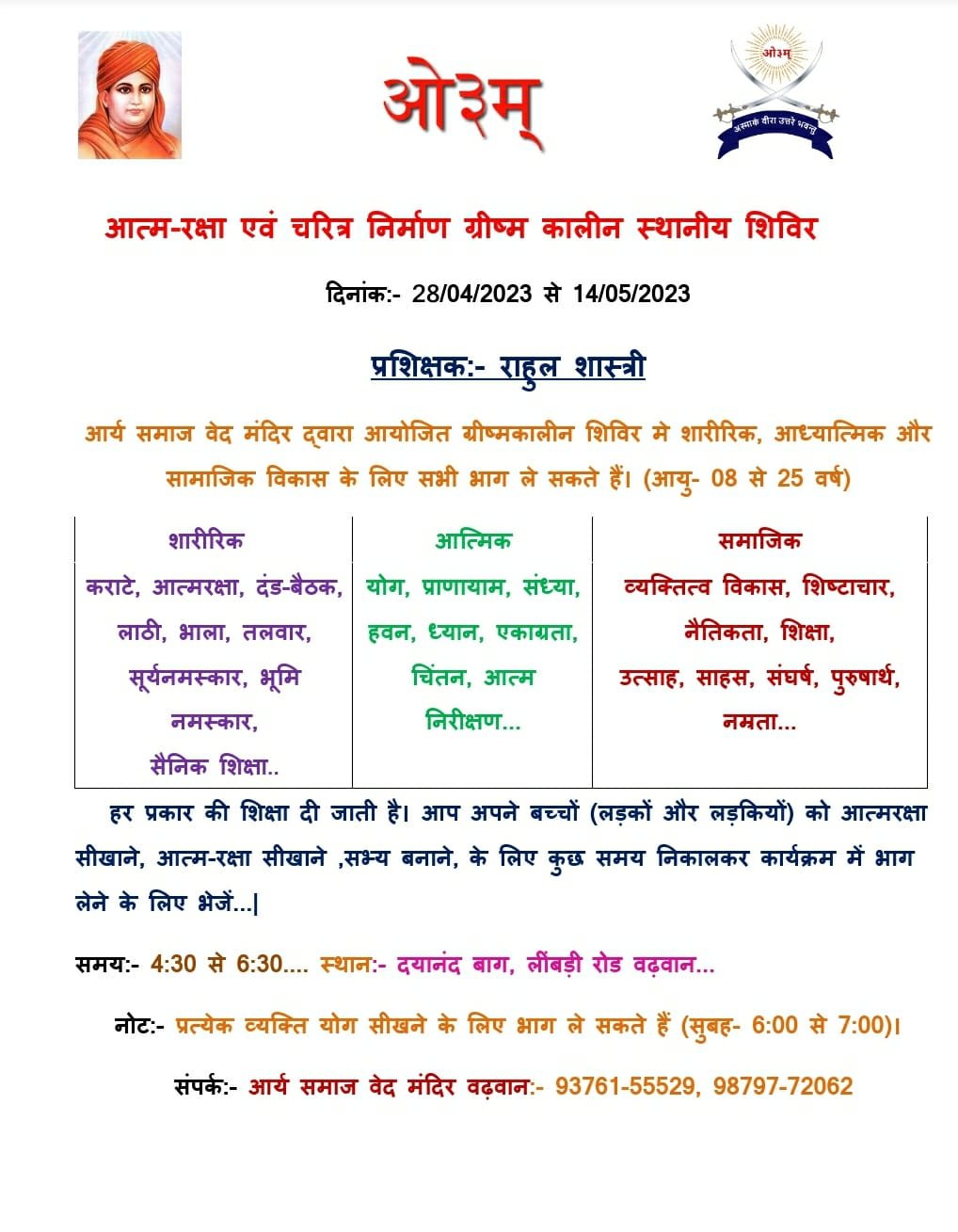 प्रशिक्षक :- राहुल शास्त्री आर्य समाज वेद मंदिर द्वारा आयोजित ग्रीष्म कालीन शिविर में शारीरिक, आध्यात्मिक और सामाजिक विकास के लिए सभी भाग ले सकते हैं।