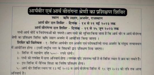 स्थान – ऋषि उद्यान, अजमेर, राजस्थान आर्य वीर दल शिविर दिनांक – १४ से २१ मई २०२३ तक