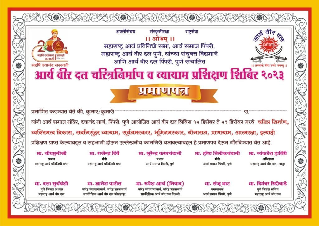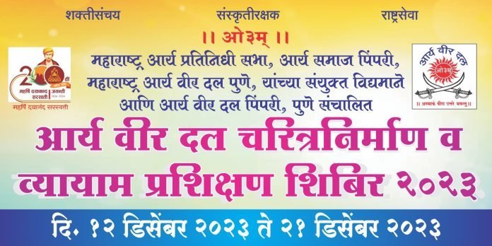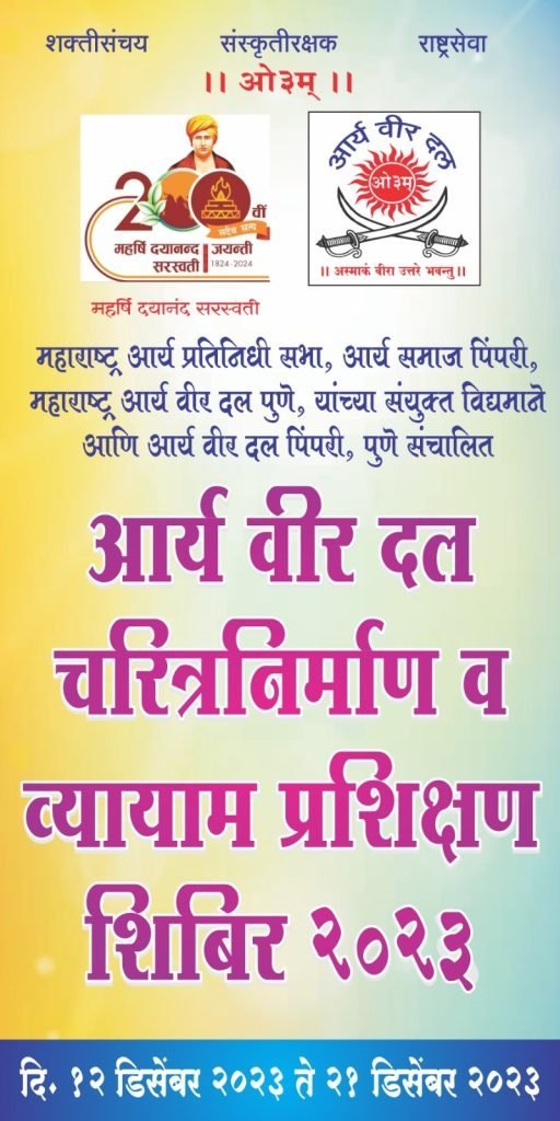 पिंपरी चिंचवड शहर के स्कूलों में 5000 बच्चों का शिविर का आयोजन होगा । और सभी स्कूलों से अनुमति मिल चुकी है स्वामी महर्षि दयानंद सरस्वती के 200 जयंती के के उपलक्ष में आर्य समाज पिंपरी का वार्षिक स्वर्ण जयंती समारोह के अवसर पर शिविर का आयोजन किया गया है। शिविर का समारोह 22 दिसंबर को किया जाएगा उसी दिन आर्य समाज पिंपरी का वार्षिक उत्सव का उद्घाटन समारोह भी है ।