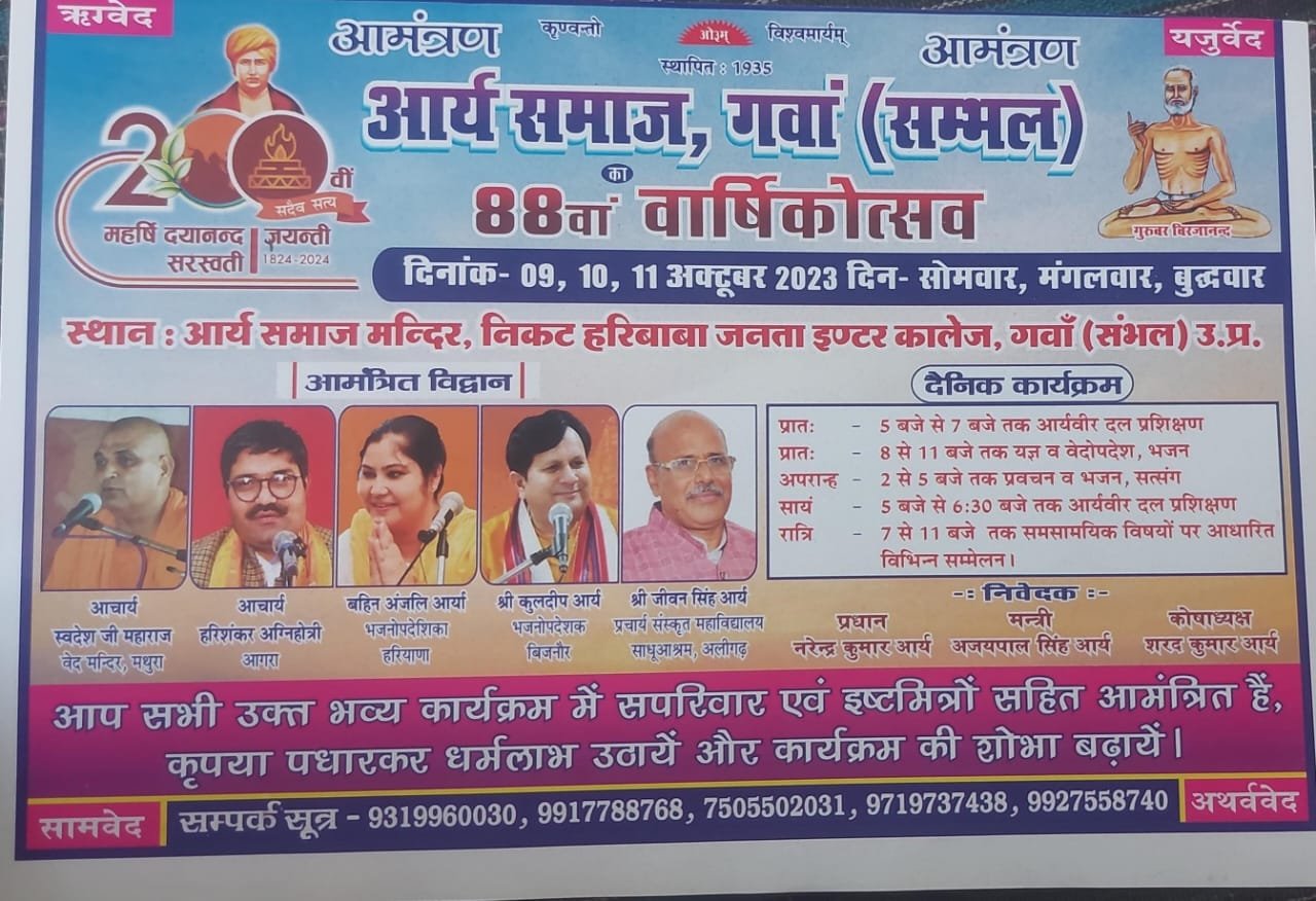 सेवा मानव को मानव से जोड़ने वाली महत्वपूर्ण कड़ी है। सेवा करना तप समान है। सेवा करने वाले के हृदय में प्रेम, करुणा, उदारता, परोपकार और सहनशीलता का होना आवश्यक है। कार्यक्रम का संचालन यशपाल शास्त्री ने किया कार्यक्रम में नरेंद्र कुमार आर्य, अखिलेश अग्रवाल, अजय पाल सिंह, शरद कुमार, कृष्ण कुमार आर्य, अशोक कुमार आर्य, गोविंद आर्य, नवनीत भटनागर, आनंद स्वरूप अग्रवाल, अजीत भटनागर, वेद प्रकाश गुप्ता, रामसेवक, जितेंद्र कुमार शर्मा, विपिन कुमार आर्य, हर्षित शर्मा, चंद्रपाल आर्य, देवव्रत आर्य, रजनीश कुमार, वैभव कुमार, दीपक कुमार, रामवीर सिंह शास्त्री, तिलक सिंह आर्य, डॉ ओमपाल आर्य, प्रदीप कुमार आर्य, तिलक सिंह आर्य एवं क्षेत्रीय आर्य समाजों के पदाधिकारी तथा कार्यकर्ता मौजूद रहे ।