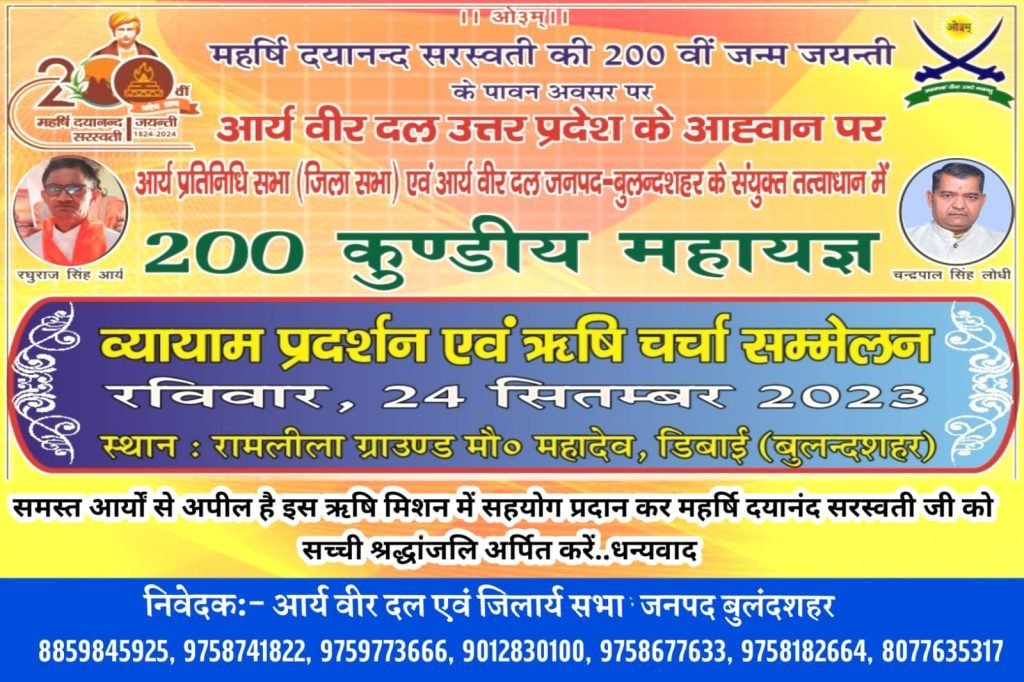 आपको जानकर अत्यन्त हर्ष होगा कि एक ऐसे व्यक्तित्व जिनका पूरा जीवन ऐसे संघर्ष की कहानी है जिसने संसार के कल्याण के लिये 17 बार जहर पिया। अज्ञान, अन्याय, ॐ अविश्वास, अधर्म, पाखण्ड के विरोधी, समग्र क्रान्ति के अग्रदूत, महिला, अनाथ, विधवा व दलितों के उद्धारक, स्वतन्त्रता सेनानियों के प्रेरणापुंज, आजादी का देवता, ईश्वरीय ज्ञान, वेदों को पुनः स्थापित करने वाला, संस्कृत व संस्कृति का ध्वजवाहक, युग दृष्टा, अखण्ड ब्रह्मचारी आनंदकंद ऋषि दयानन्द की 200 वीं पावन जन्म जयन्ती के शुभ अवसर पर आर्य वीर दल उत्तर प्रदेश 15 अक्टूबर 2023 दिन रविवार को आचार्य स्वदेश जी महाराज, मथुरा की अध्यक्षता में एवं महान समाजसेवी महाशय राजीव गुलाटी MDH के पावन सानिध्य में 200 कुण्डीय यज्ञ के साथ प्रान्तीय आर्य वीर अधिकारी कार्यकर्ता सम्मेलन आयोजित करने जा रहा है।