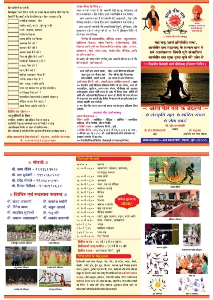 यह प्रशिक्षण शिविर 5 मई 2023 से 14 मई 2023 तक चलेगा। इस प्रशिक्षण शिविर में 12 वर्ष से 25 वर्ष के युवाओं में भाग ले सकते हैं शिविर आर्य समाज पिंपरी पीछे इस प्रशिक्षण शिविर में शारीरिक बौद्धिक सामाजिक व्यक्ति विकास चरित्र निर्माण का प्रेरणा दिया जाएगा।
