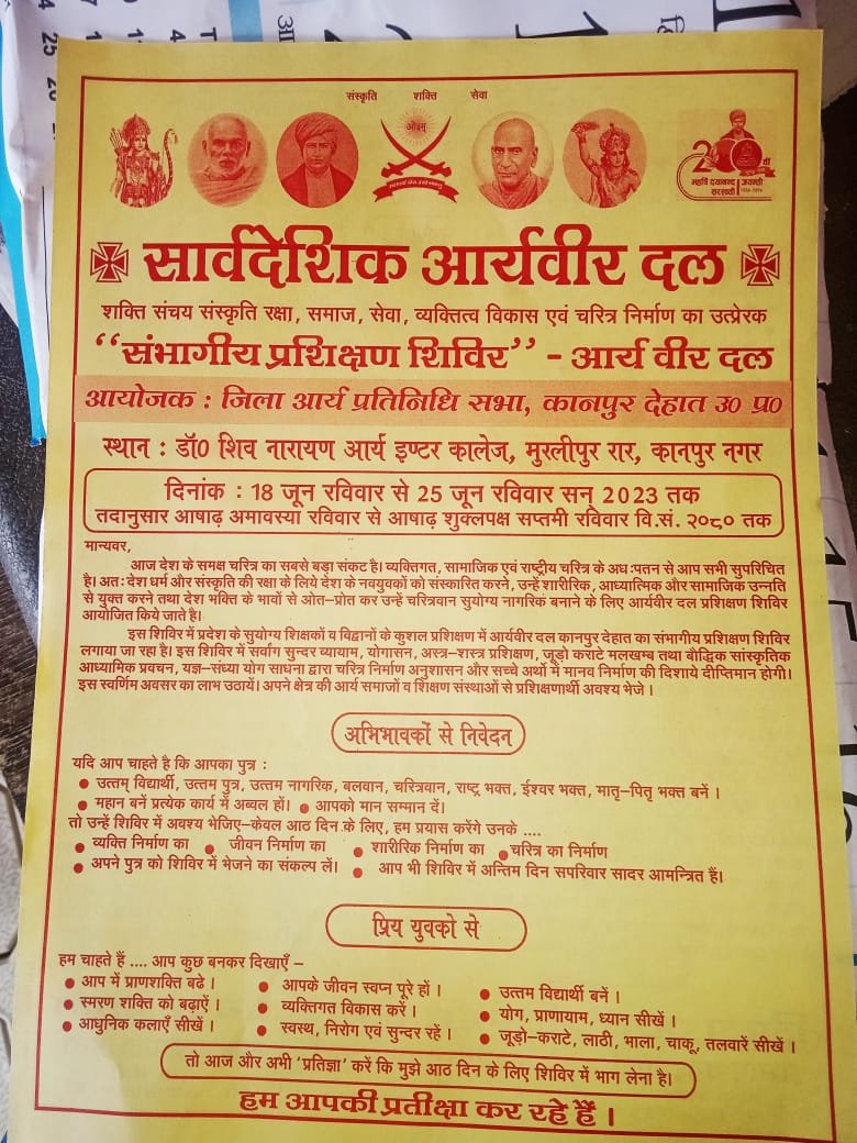 • आज देश के समक्ष चरित्र का सबसे बड़ा संकट है। व्यक्तिगत, सामाजिक एवं राष्ट्रीय चरित्र के अधःपतन से आप सभी सुपरिचित मान्यवर,है। अतः देश धर्म और संस्कृति की रक्षा के लिये देश के नवयुवकों को संस्कारित करने, उन्हें शारीरिक, आध्यात्मिक और सामाजिक उन्नति से युक्त करने तथा देश भक्ति के भावों से ओत-प्रोत कर उन्हें चरित्रवान सुयोग्य नागरिक बनाने के लिए आर्यवीर दल प्रशिक्षण शिविर आयोजित किये जाते है।इस शिविर में प्रदेश के सुयोग्य शिक्षकों व विद्वानों के कुशल प्रशिक्षण में आर्यवीर दल कानपुर देहात का संभागीय प्रशिक्षण शिविर लगाया जा रहा है। इस शिविर में सर्वांग सुन्दर व्यायाम, योगासन, अस्त्र-शस्त्र प्रशिक्षण, जूडो कराटे मलखम्ब तथा बौद्धिक सांस्कृतिक आध्यामिक प्रवचन, यज्ञ-संध्या योग साधना द्वारा चरित्र निर्माण अनुशासन और सच्चे अर्थों में मानव निर्माण की दिशाये दीप्तिमान होगी। इस स्वर्णिम अवसर का लाभ उठायें। अपने क्षेत्र की आर्य समाजों व शिक्षण संस्थाओं से प्रशिक्षणार्थी अवश्य भेजे ।अभिभावकों से निवेदन यदि आप चाहते है कि आपका पुत्र