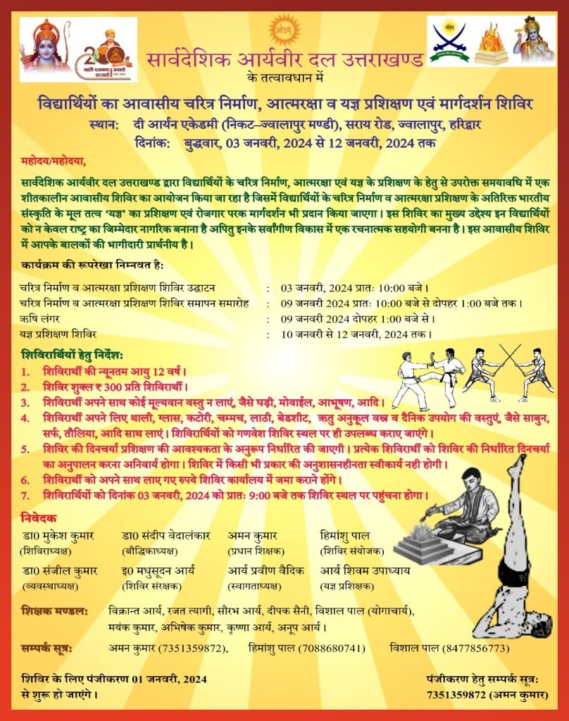 सार्वदेशिक आर्यवीर दल उत्तराखण्ड द्वारा विद्यार्थियों के चरित्र निर्माण, आत्मरक्षा एवं यज्ञ के प्रशिक्षण के हेतु से उपरोक्त समयावधि में एक शीतकालीन आवासीय शिविर का आयोजन किया जा रहा है जिसमें विद्यार्थियों के चरित्र निर्माण व आत्मरक्षा प्रशिक्षण के अतिरिक्त भारतीय संस्कृति के मूल तत्व ‘यज्ञ’ का प्रशिक्षण एवं रोजगार परक मार्गदर्शन भी प्रदान किया जाएगा। इस शिविर का मुख्य उद्देश्य इन विद्यार्थियों को न केवल राष्ट्र का जिम्मेदार नागरिक बनाना है अपितु इनके सर्वांगीण विकास में एक रचनात्मक सहयोगी बनना है। इस आवासीय शिविर में आपके बालकों की भागीदारी प्रार्थनीय है।