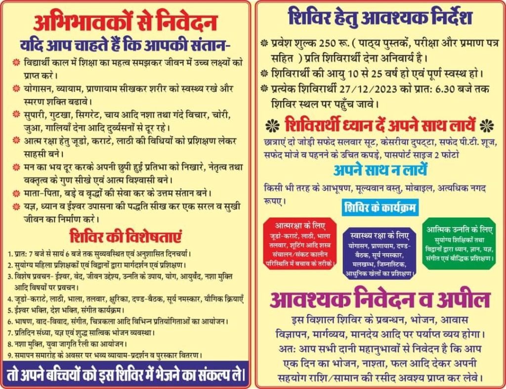 - प्रत्येक शिविरार्थी 27/12/2023 को प्रातः 6.30 बजे तक शिविर स्थल पर पहुँच जावे।