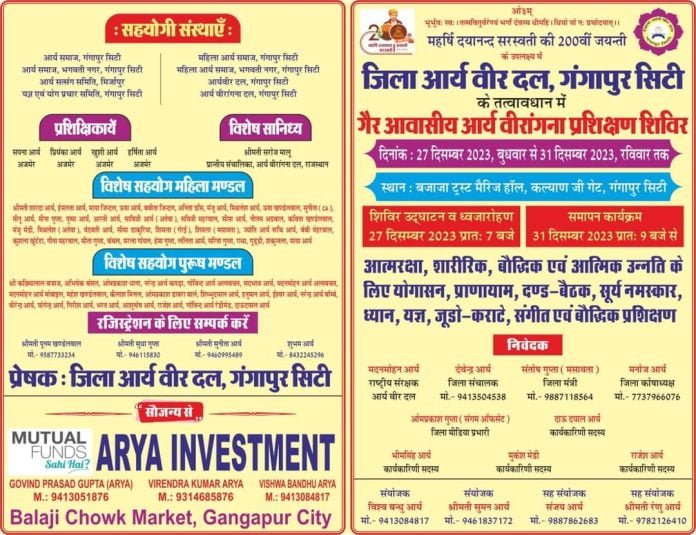 आर्य समाज, भगवती नगर, गंगापुर सिटी आर्य सत्संग समिति, मिर्जापुर यज्ञ एवं योग प्रचार समिति, गंगापुर सिटी