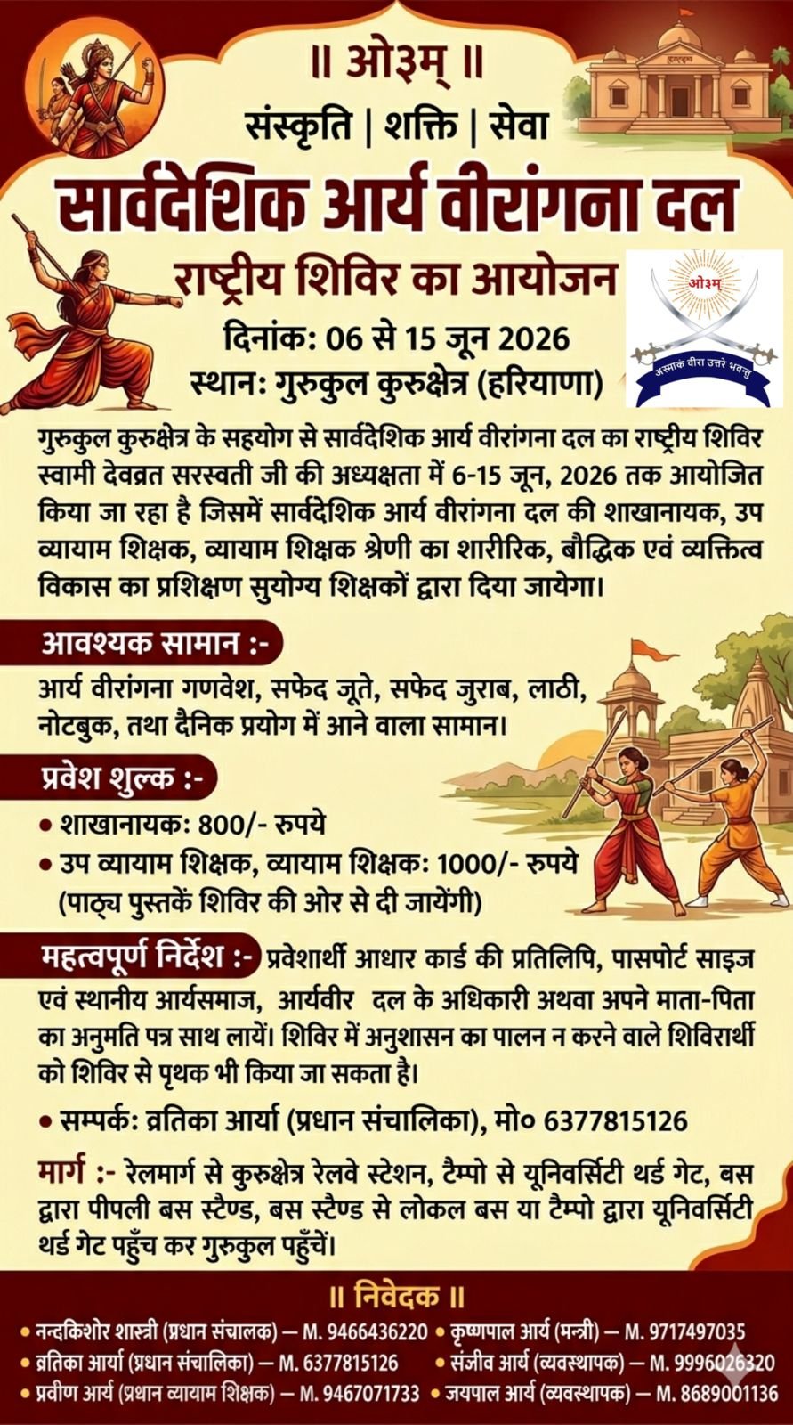 यह राष्ट्रीय शिविर युवतियों के लिए एक सुनहरा अवसर है, जहाँ वे न केवल आत्मरक्षा और शारीरिक प्रशिक्षण प्राप्त करेंगी बल्कि वैदिक संस्कृति और जीवन मूल्यों को भी आत्मसात करेंगी। यदि आप अपने जीवन में अनुशासन, शक्ति और सेवा भावना विकसित करना चाहती हैं, तो यह शिविर आपके लिए अत्यंत लाभदायक है।