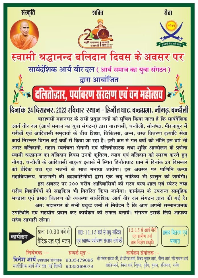 वाराणसी महानगर के सभी प्रबुद्ध जनों को सूचित किया जाता है कि सार्वदेशिक आर्य वीर दल (आर्य समाज का युवा संगठन) द्वारा वाराणसी, चन्दौली, सोनभद्र, मीरजापुर में गरीबों एवं आदिवासी समुदायों के बीच शिक्षा, चिकित्सा, अन्न, वस्त्र वितरण इत्यादि सेवा कार्य निरन्तर विगत कई वर्षों से किया जा रहा है। इसी क्रम में गत वर्षों की भाँति इस वर्ष भी अमर बलिदानी, महान स्वतंत्रता सेनानी एवं दलितोद्धारक तथा शुद्धि आन्दोलन के प्रणेता स्वामी श्रद्धानन्द का बलिदान दिवस उनके कृतित्व, त्याग एवं बलिदान को स्मरण करते हुए नौगढ़, चन्दौली के आदिवासी बाहुल्य इलाके में स्थित हिनौतघाट ग्राम में दिनांक 24 दिसम्बर को वैदिक यज्ञ एवं भजनों के साथ मनाया जायेगा। इस अवसर पर पाणिनि कन्या महाविद्यालय, वाराणसी की ब्रह्मचारिणीयों द्वारा एक लघु नाटिका भी प्रस्तुत की जायेगी।