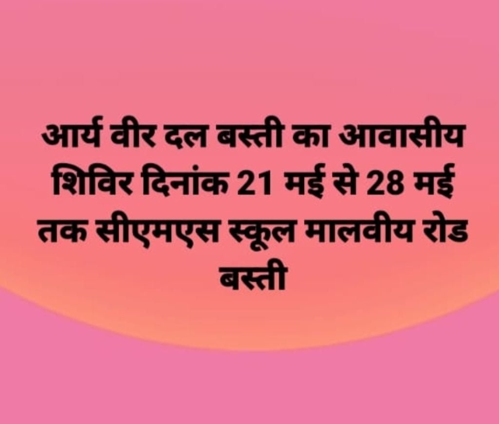 सार्वजनिक आर्य वीर दल के संचालक आचार्य देवव्रत आर्य जी के पावन सानिध्य में आर्य वीर दल बस्ती उत्तर प्रदेश द्वारा आयोजित 21 मई से 28 मई तक आर्य वीर दल चरित्र निर्माण शिविर आर्यवीर सैनी का विशेष प्रशिक्षण शिविर आर्य वीर दल बस्ती मंडल द्वारा आयोजित किया जा रहा है।